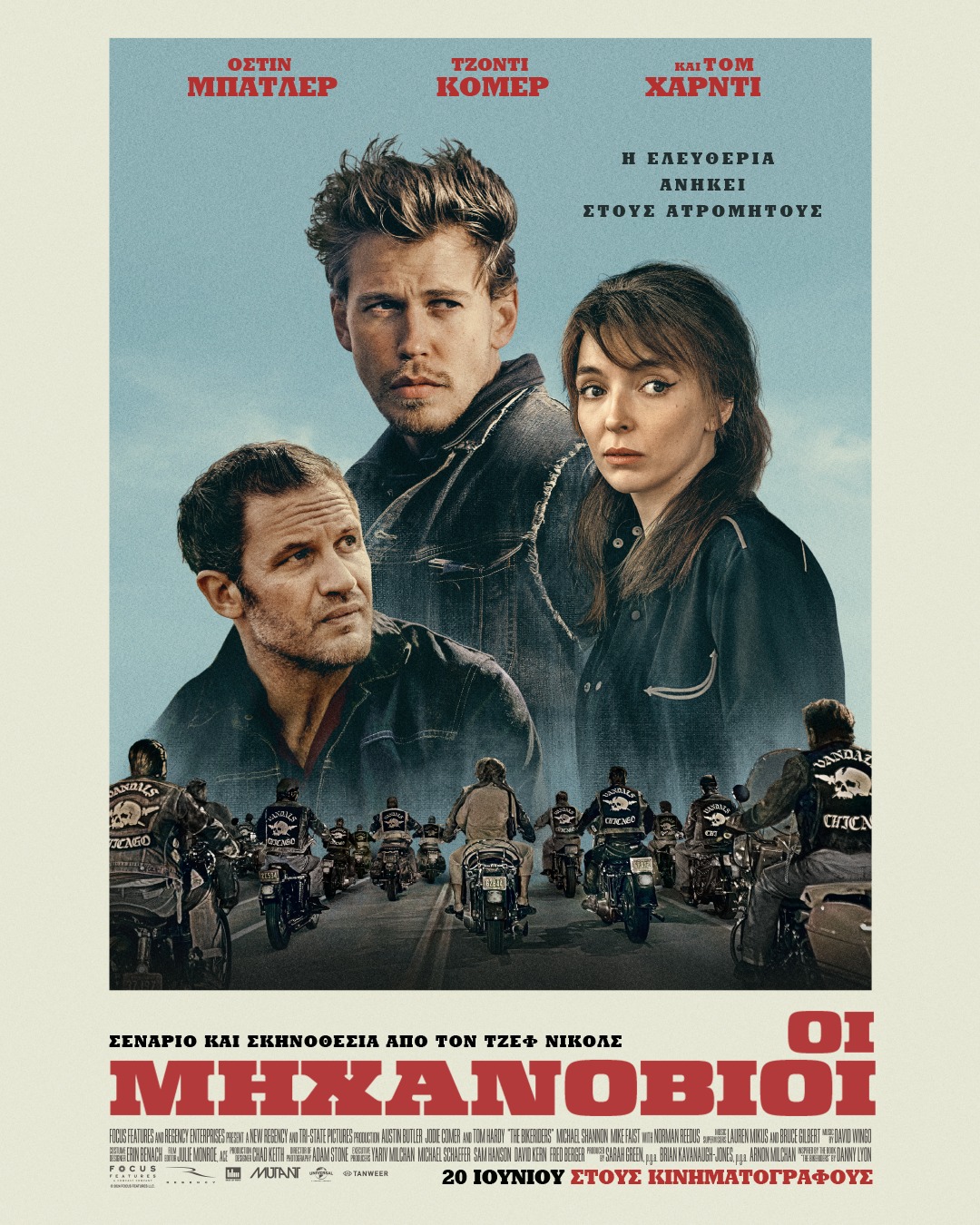 Το «Bikeriders» είναι περισσότερο ταινία ανασύστασης εποχής, μια δημιουργία που πρωτίστως θέλει να σκιαγραφήσει τον ειδικότερο χώρο, τον γενικότερο χρόνο και τους ιδιαίτερους ανθρώπους της εποχής. Και το πετυχαίνει θαυμάσια, χωρίς να μένει μόνο στην επιφάνεια – έχει «ψαχνό». Στο επίκεντρο βρίσκεται ο Μπένι, ένας εξωπραγματικά όμορφος νεαρός, που δεν θέλει τίποτε άλλο στη ζωή του από το να καβαλάει τη μοτοσικλέτα του ελεύθερος, να ζει στο (άμεσο) παρόν και να μη δίνει λογαριασμό πουθενά. Επειδή, όμως, η ανάγκη του ανήκειν είναι εγγεγραμμένη στο γενετικό υλικό μας κι επειδή είμαστε σε ταινία του Νίκολς και η ελευθερία (μοιραία) θα παταχθεί, ο Μπένι προσχωρεί σε δυο «παρατάξεις», οι οποίες διεκδικούν την αποκλειστικότητά του. Τη μία εκπροσωπεί ο Τζόνι, ηγέτης των Βανδάλων, μιας συμμορίας μοτοσικλετιστών στην οποία έχει προσχωρήσει ο Μπένι, την άλλη η Κάθι, μια ερωτοχτυπημένη γυναίκα που δέχεται να εντάξει στη ζωή της τους Βάνδαλους, προκειμένου να είναι δίπλα στον Μπένι.