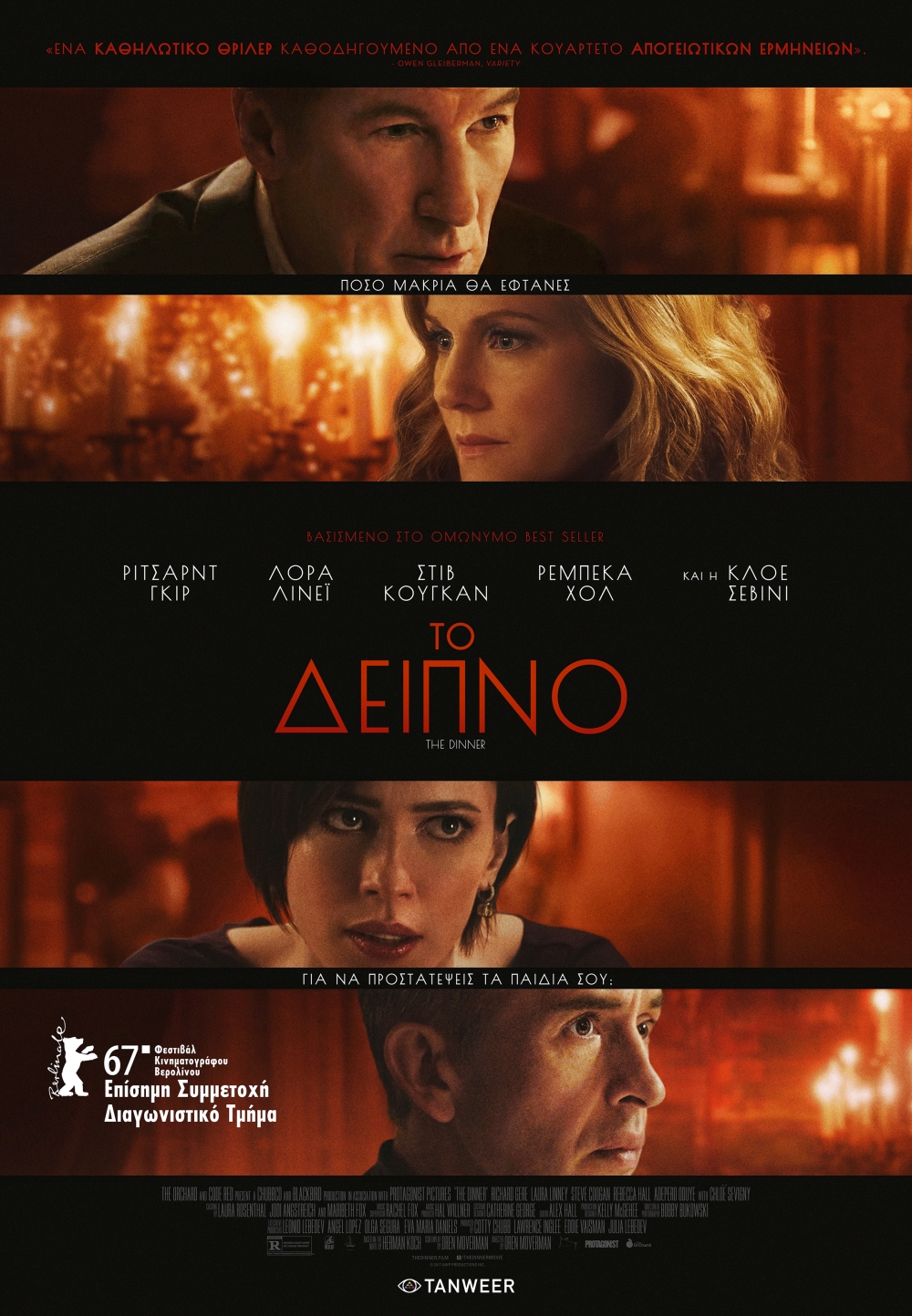Ένα οικογενειακό τραπέζι ανάμεσα σε δύο αδέρφια (ο Κούγκαν καθηγητής, ο Γκιρ πολιτικός με μεγάλες βλέψεις) και τις γυναίκες τους (Λόρα Λίνεϊ, Ρεμπέκα Χολ), που εξ αρχής μας προϊδεάζει για τις εντάσεις που θα φέρει στην επιφάνεια, εξελίσσεται ασφαλώς σε πολλά περισσότερα από ένα σμίξιμο μετά από καιρό. Στη σκιά του αδιανόητου εγκλήματος που διέπραξαν οι πιτσιρικάδες γιοι τους, τα δύο ζευγάρια πετούν πάνω στα γκουρμέ πιάτα ενός πανάκριβου ρεστοράν πάθη, εγωισμούς και οικογενειακά μυστικά.
