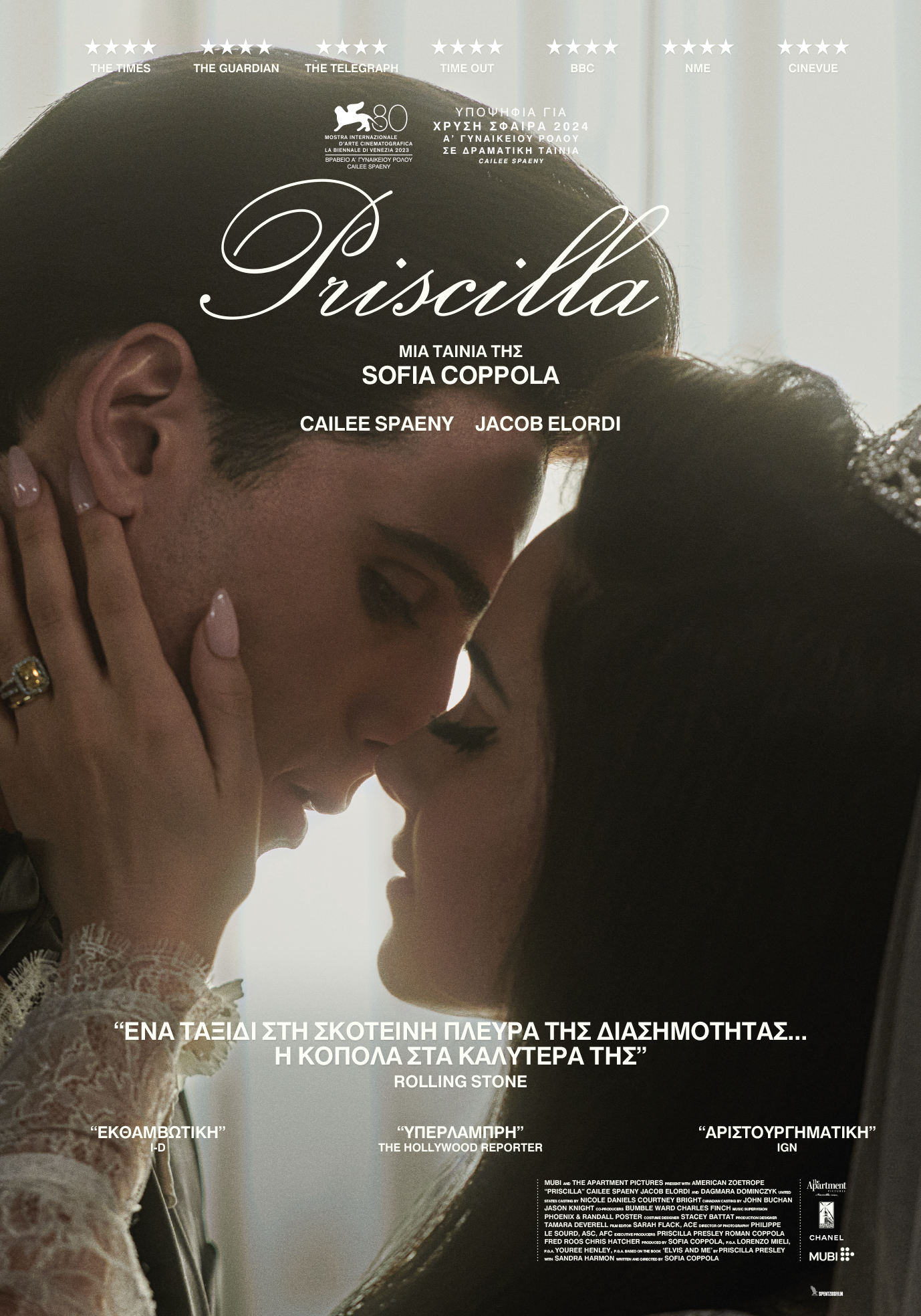 Στον αντίποδα μιας αστραφτερής και θορυβώδους βιογραφίας, όπως ήταν το περσινό «Elvis» του Μπαζ Λούρμαν, η «Priscilla» κατεβάζει τους τόνους, χαμηλώνει τους φωτισμούς, διώχνει τις παστέλ αποχρώσεις από τη φωτογραφία, γίνεται η ψύχραιμη και πιο εσωστρεφής απάντηση της Κόπολα για τις λιγότερο ελκυστικές λεπτομέρειες μιας ζωής υπό τη βαριά σκιά των προβολέων της δημοσιότητας. Κυρίως όμως είναι το χρονικό μιας σκληρής αγάπης που ναι μεν ξεδιπλώνεται υπό τους ήχους πανέμορφων ποπ τραγουδιών της εποχής, στην ουσία όμως κουβαλά μέσα της κάτι από την παθογένεια εκείνων των χιμαιρικών και κατ' επίφαση ειδυλλιακών ημερών.